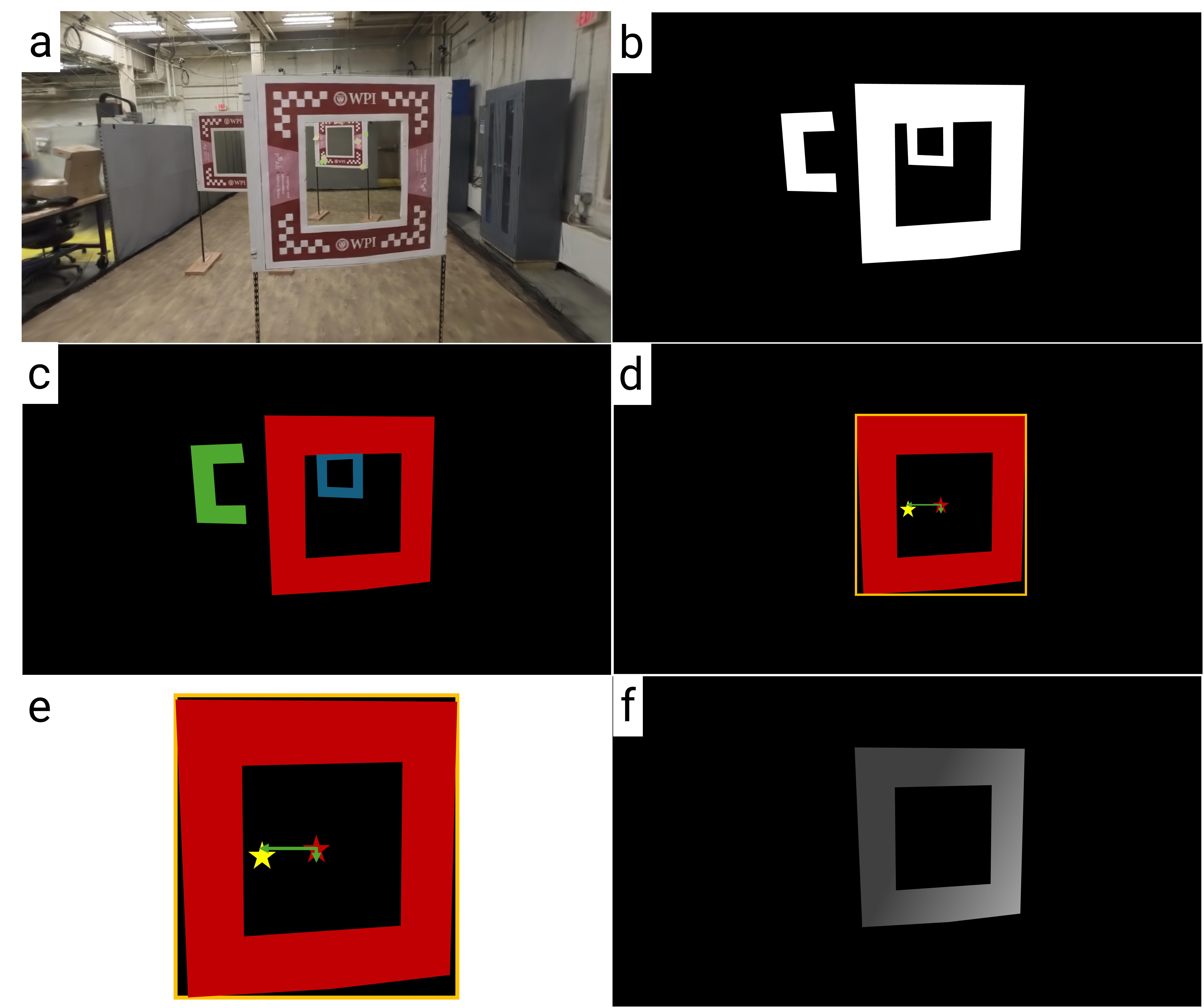 Your goal would be to build a lightweight neural network that has good accuracy that can be used in the next steps. To accomplish this, you will have to generate windows in simulation (Blender and NOT VizFlyt) from different views and backgrounds and scenarios and train your network (See Fig. 2). You are not allowed to use VizFlyt or any other reconstruction method to get any images for training. Be sure to maintain the aspect ratio of the window accurately when generating data for good generalization to the real world (the real windows are printed with no scaling). We will describe the specifications of the window next. The window is almost a square with checkerboard pattern on the edges. Each checkerboard pattern is (highlighted in blue in Fig. 3) of a grid of size \(7 \times 6\) (for X or horizontal and Y or vertical) directions. The distance from checkerboard pattern to either edge is the same dimension as one checkerboard square (yellow highlight in Fig. 3). The WPI logo will always be centered vertically and the PeAR logo will be centered horizontally (however, these can be absent too or be changed to other logos). The window will be the same WPI crimson color (rgb(172, 43, 55)) but can appear different in different lighting. Your data can randomize the viewpoint (or window pose), window lighting, window design with respect to logos, noise, the background among others. The thickness of the window is negligible compared to the height and width of the window. There can be multiple windows in the frame. Also, each window is X-Y symmetric. A high resolution PNG image and the associated PPTX file used to generate the windows are given in the starter package in the textures folder which you have downloaded before.